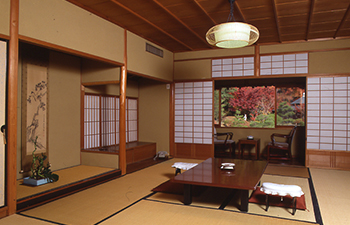 山を借景にした池泉庭園と部屋とが一体となった上質な空間を創り出しています。
