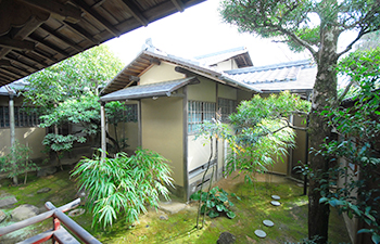 The eight-mat and six tatami-mat rooms are connected to create a wide space. While not facing the garden, the roof of the teahouse makes a charming the view from the window.
