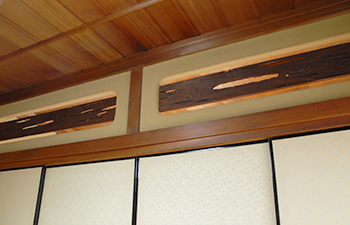 The boat-like ceiling is a unique feature of the room. The alcove post is made of rare rough-hewn cedar log from the northern mountains of Kyoto.